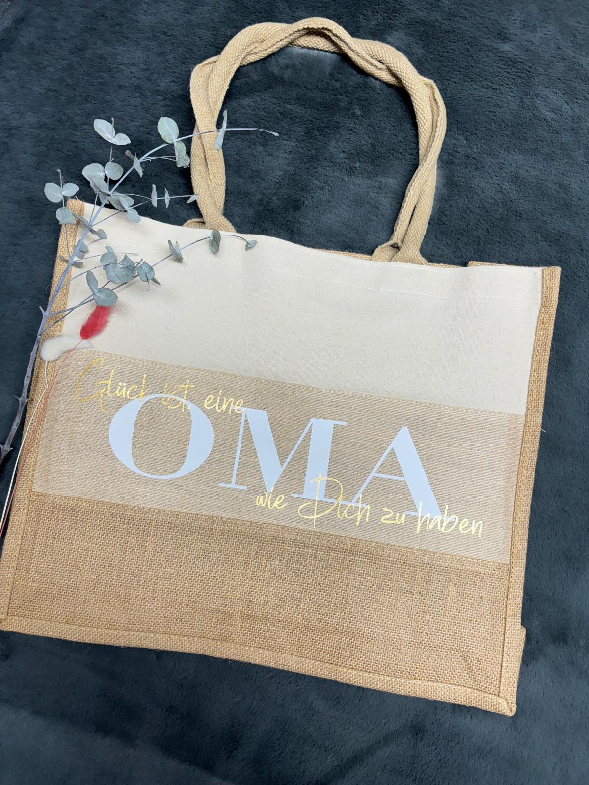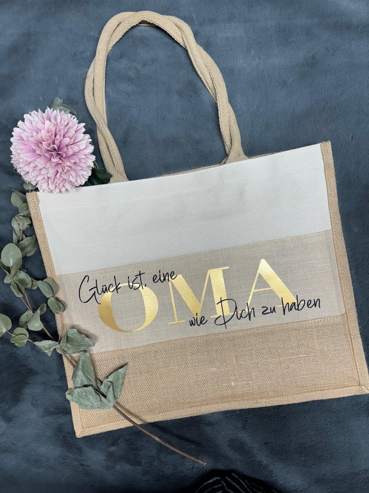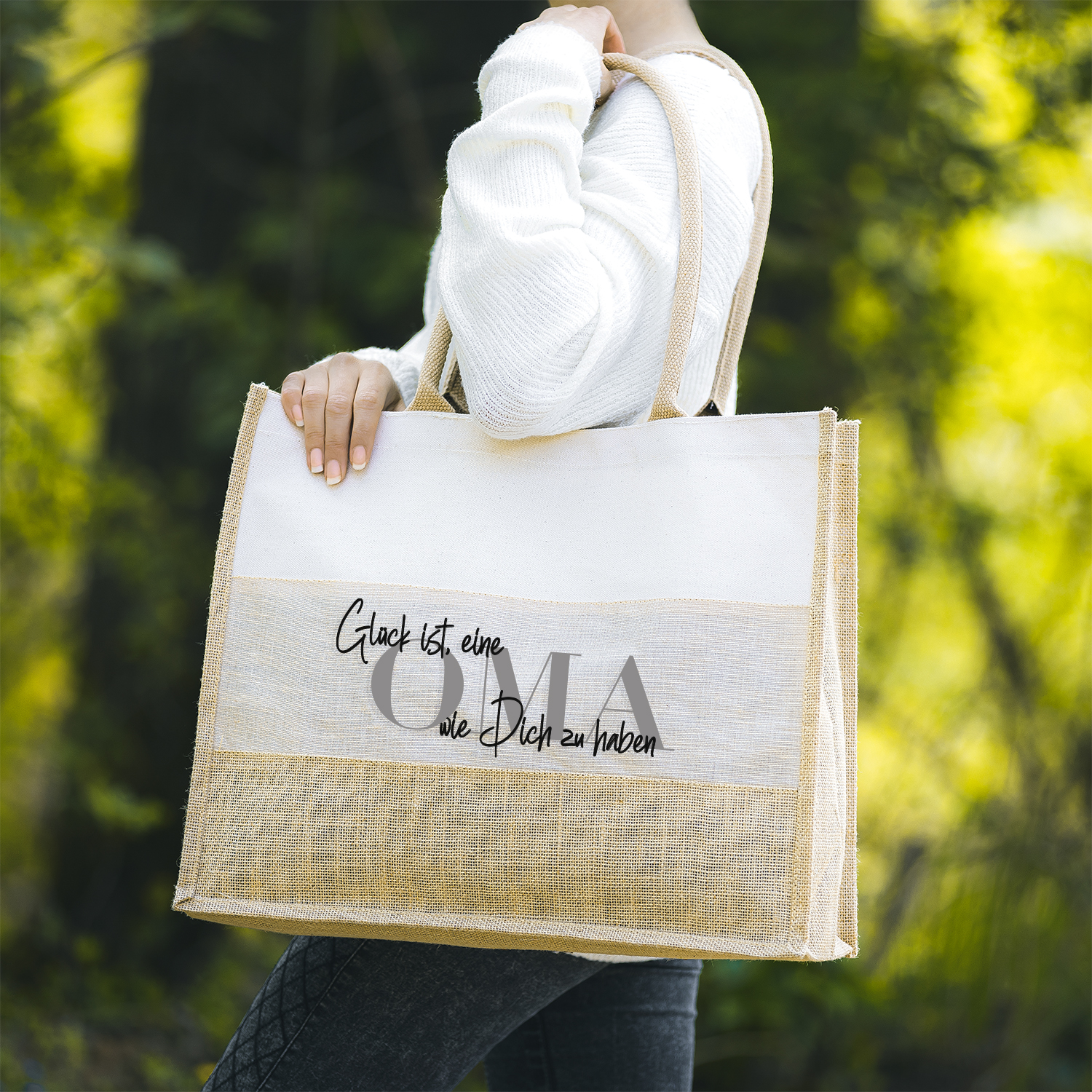 Jute-Tasche 3 farbig Shopper Motiv: Glück ist eine Oma wie dich zuhaben | personalisiert Innentasche-Reißverschluss | Fair | hochwertig Größe 35x42x15cm