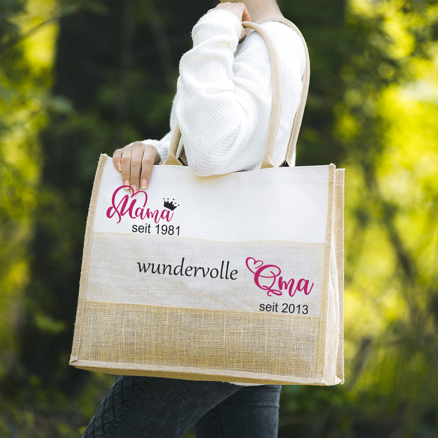 Jute-Tasche 3 farbig Shopper Motiv: Mama seit & Oma seit" | personalisiert Innentasche-Reißverschluss | Fair | hochwertig Größe 35x42x15cm