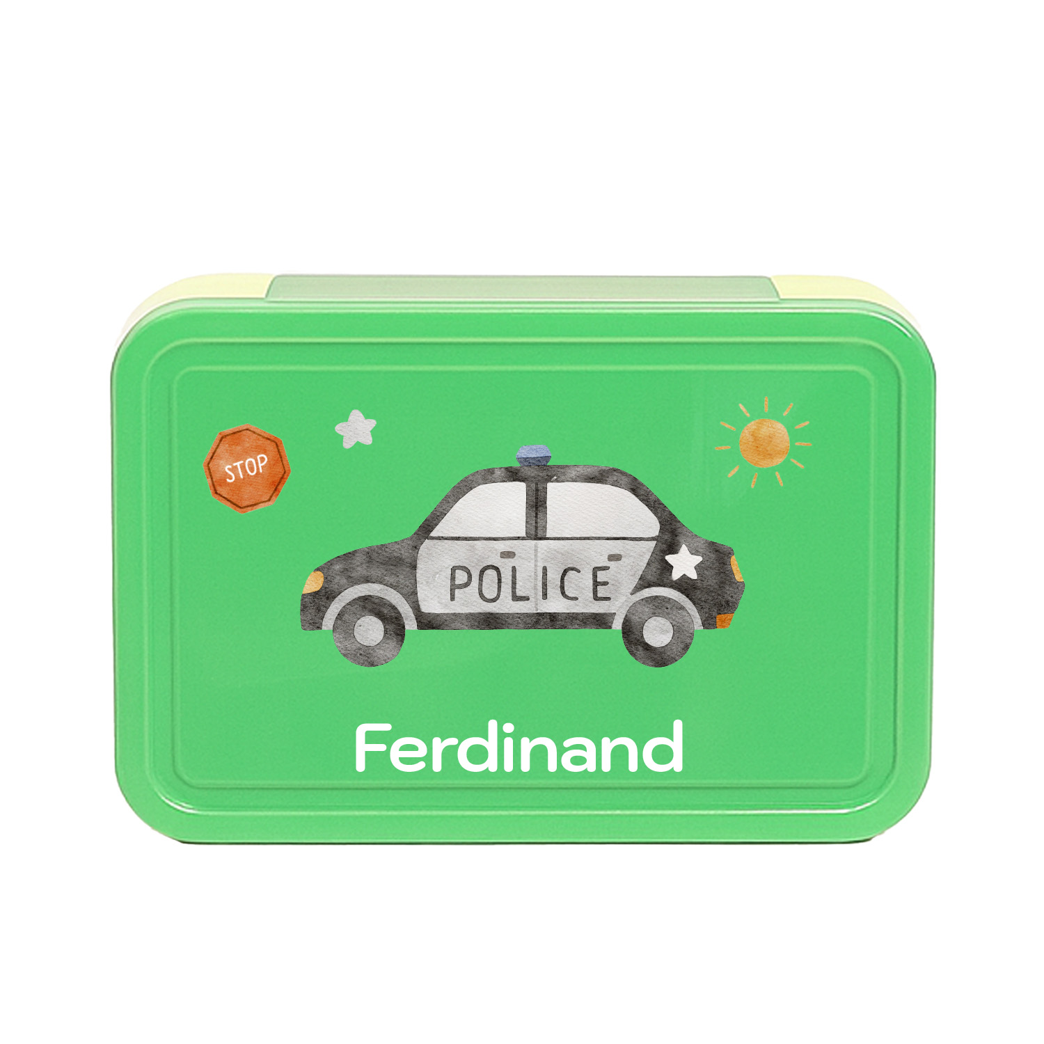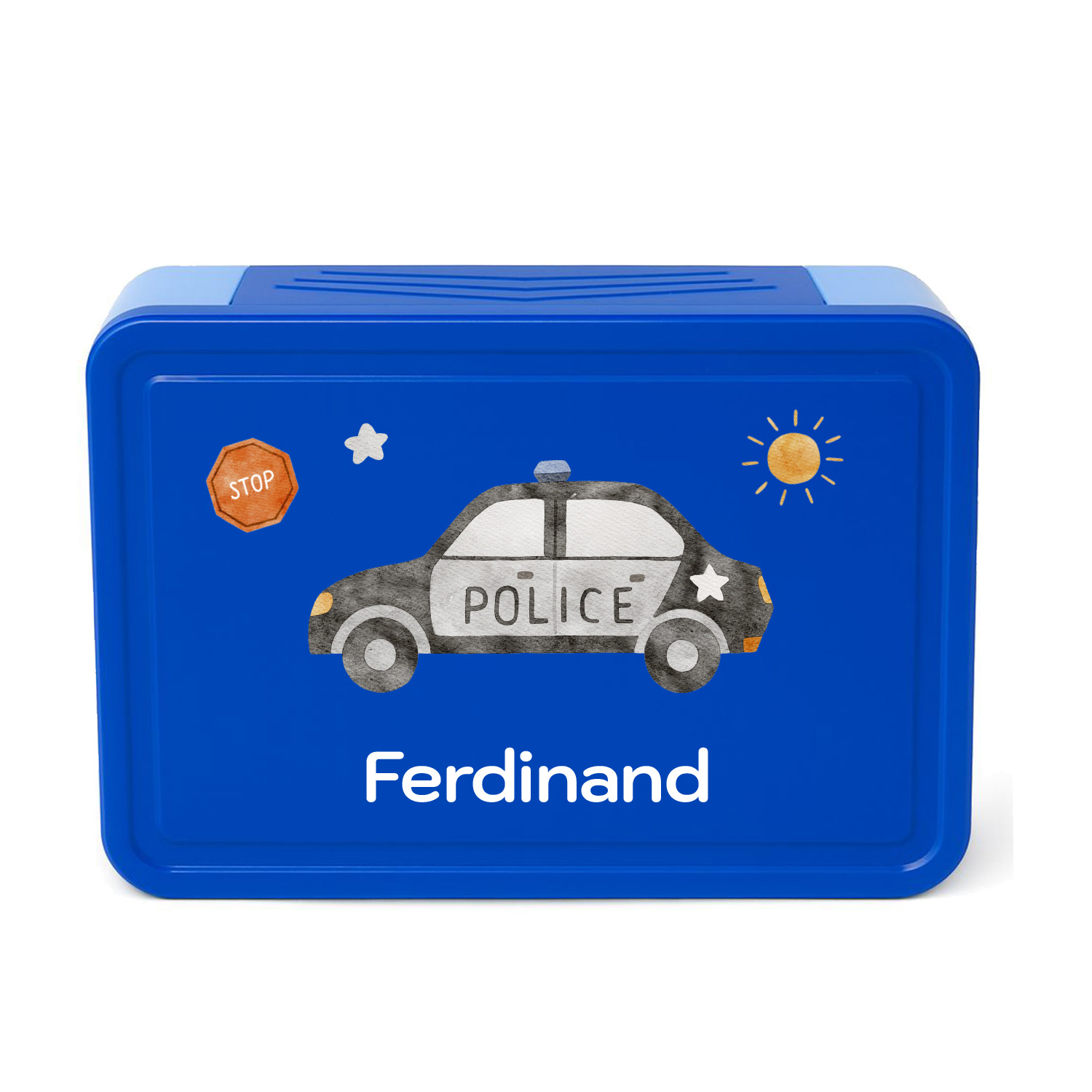 Produktbeschreibung "Personaliserte Brotdose Polizeiauto mit Name"
