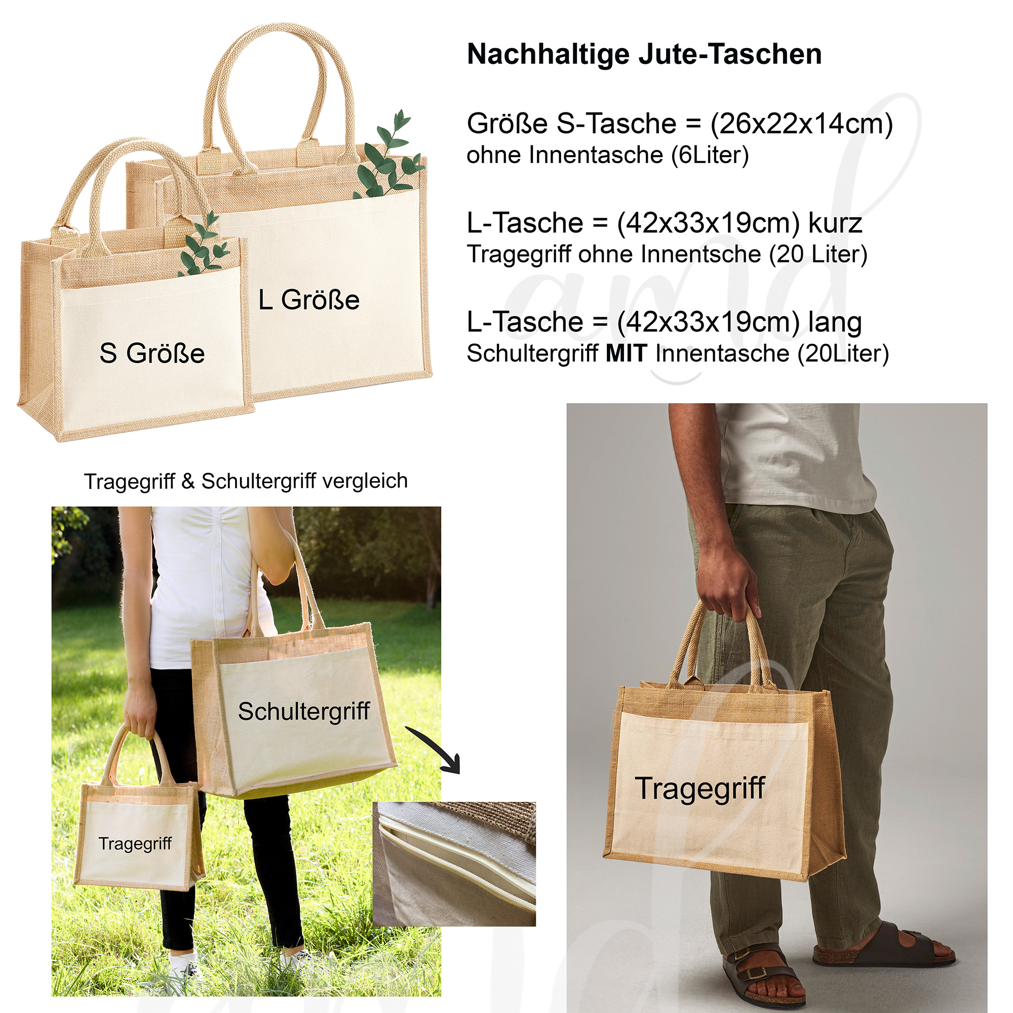 Ihr könnt aus 2 Größen auswählen – manchmal bieten wir Euch auch mehrere Designs zur Auswahl an. Der Jute Shopper macht Kleinen und Großen ganz Besonders Freude. Die Baumwollfront ist ein offenes zusätzliches Hauptfach.