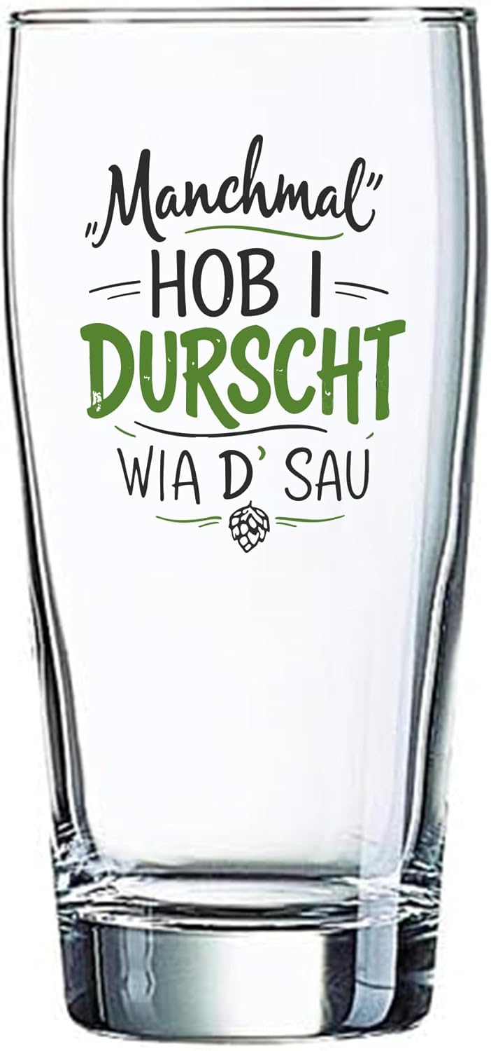Produktbeschreibung "Personalisiertes Bierglas mit lustigem Spruch – „Hob i Durscht wia d Sau“ – Geschenk für Männer, Vatertag, Papa "