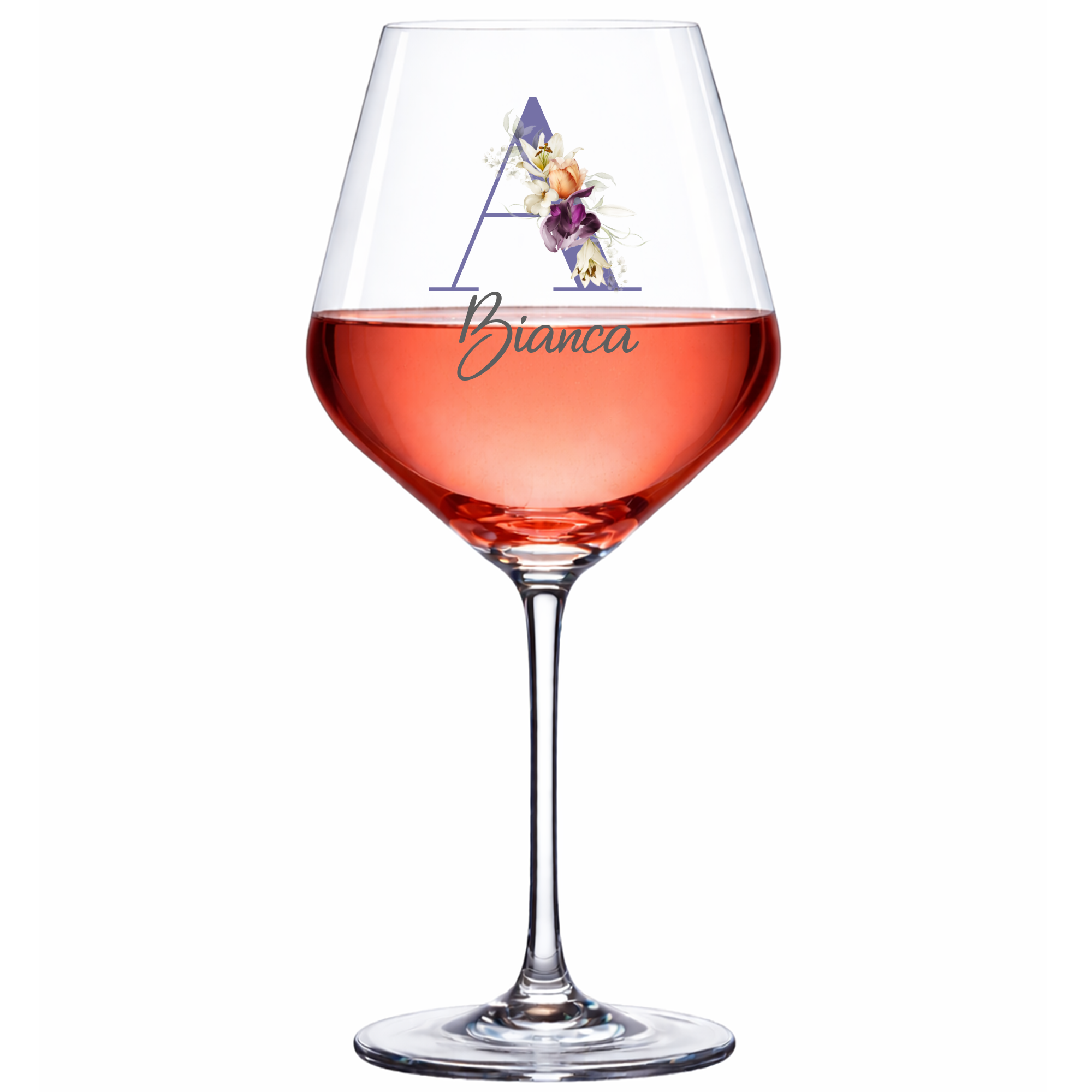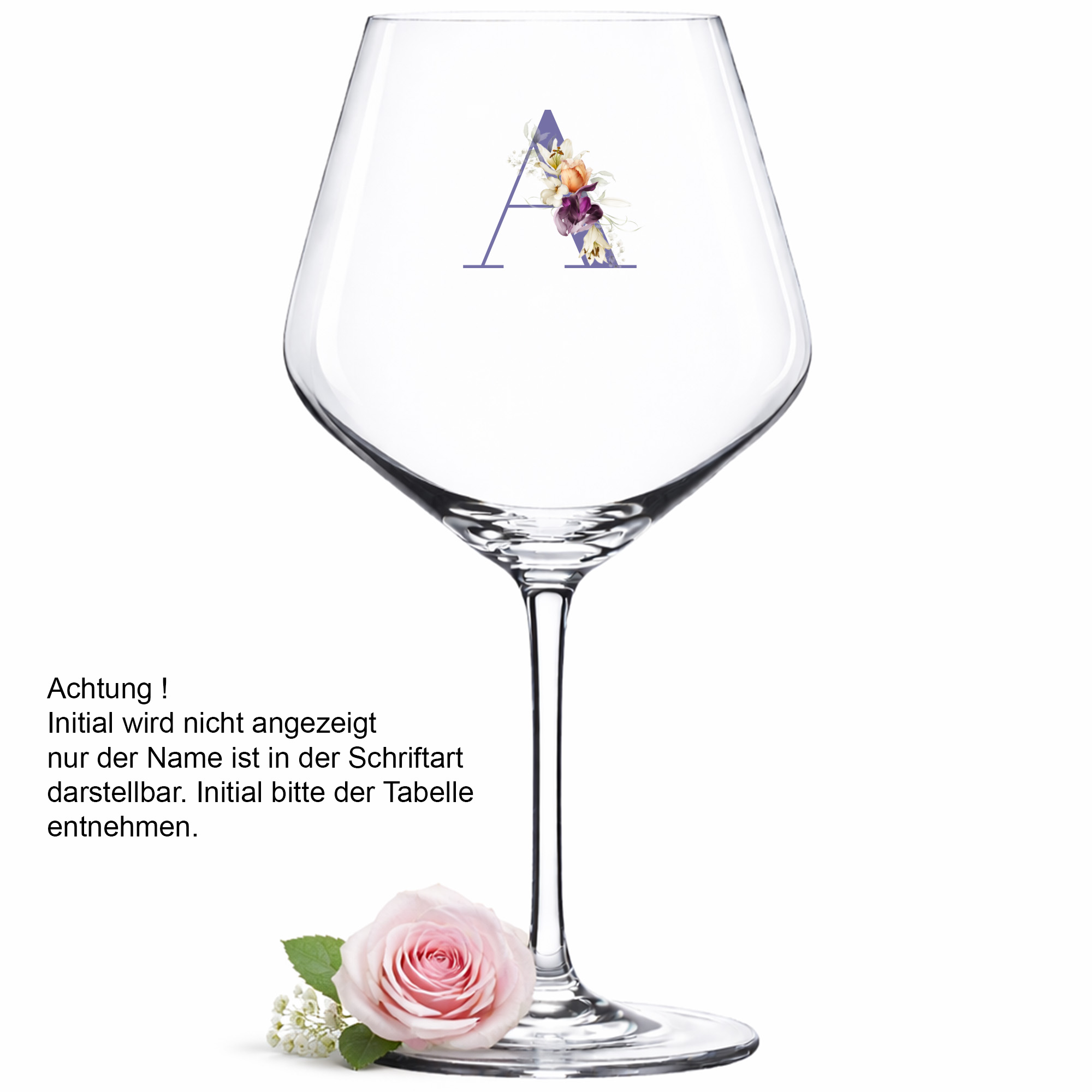 Produktbeschreibung "Personalisiertes Weinglas mit floralem Initial & Name – Lila Blumen"