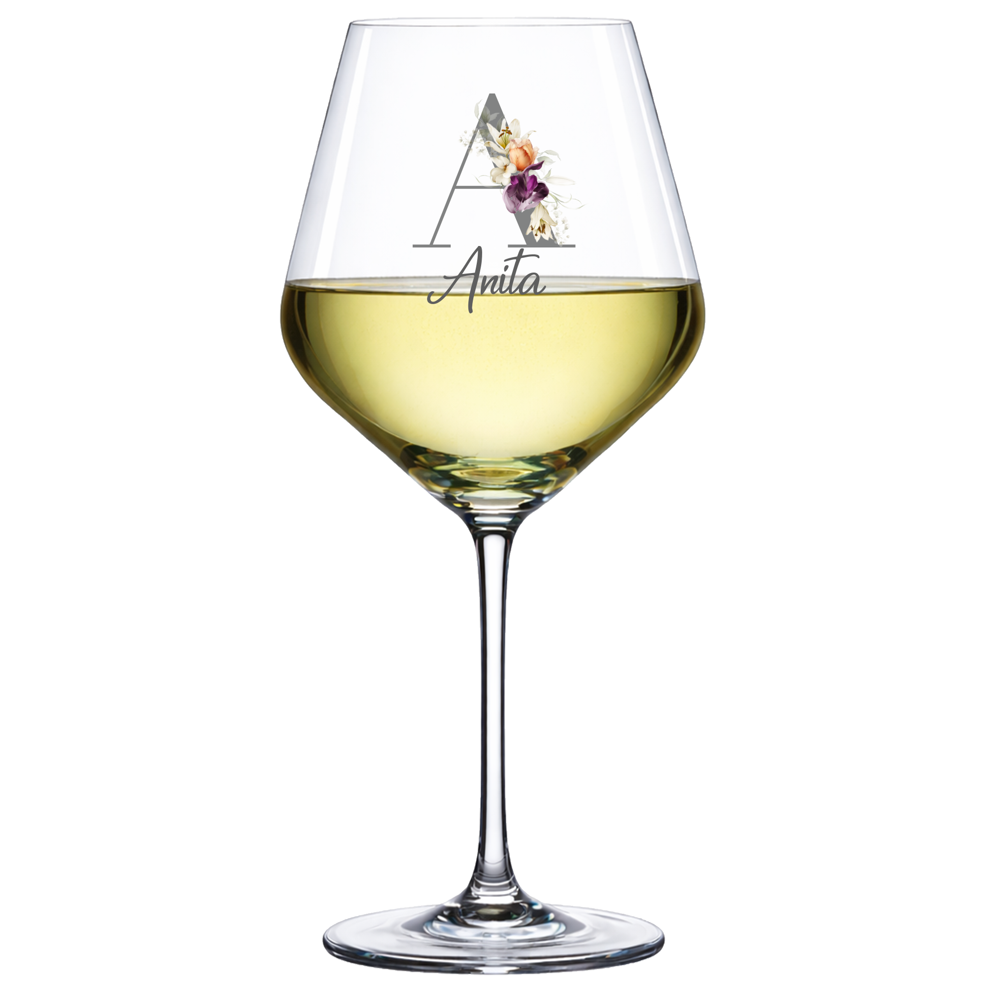Dieses wunderschöne Weinglas begeistert mit einem liebevoll gestalteten, floralen Design und deiner ganz persönlichen Note. Das Initial wird von bunten Blumen umrahmt und mit deinem Wunschnamen ergänzt – so entsteht ein einzigartiges Unikat mit besonderem Charme.