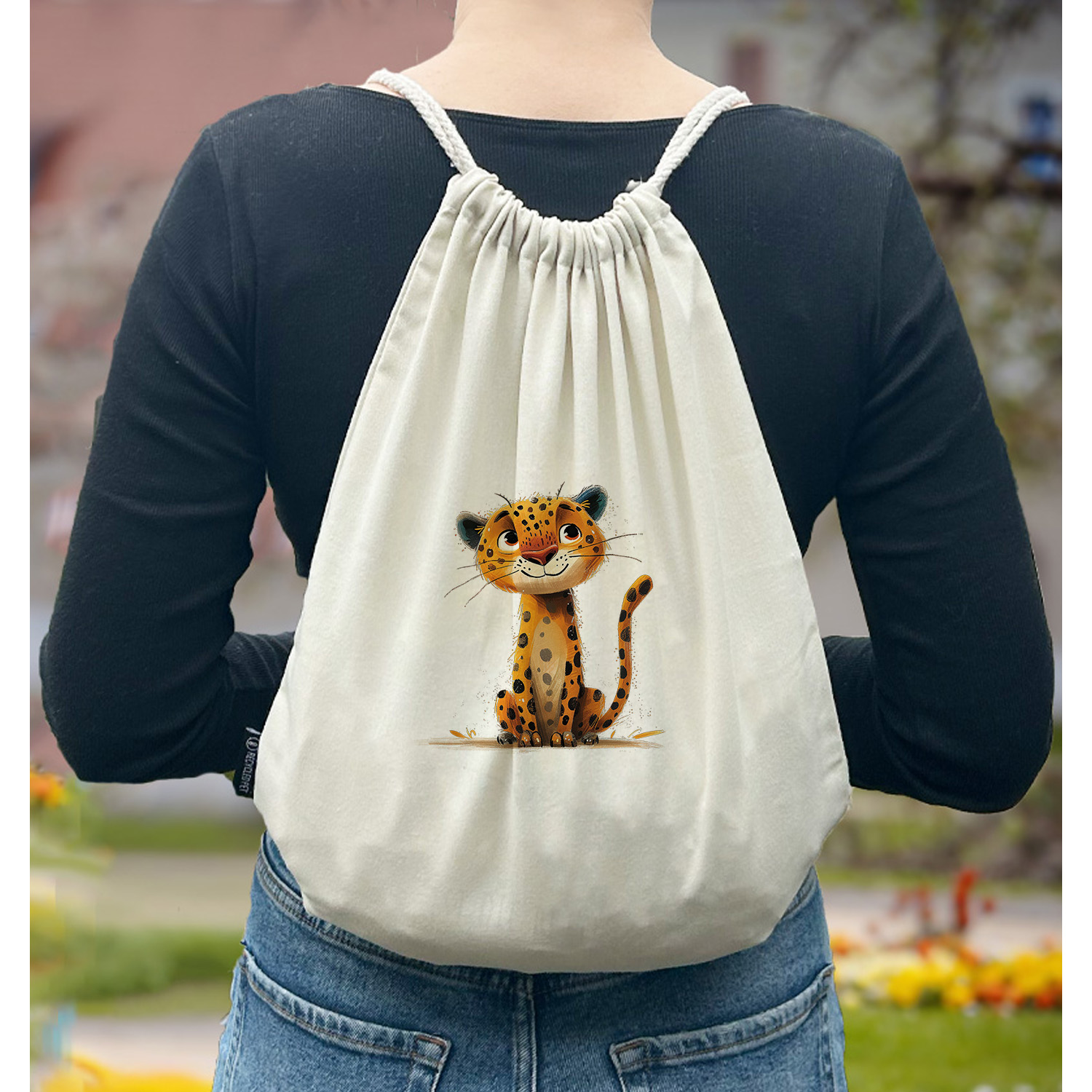 Produktbeschreibung "Turnbeutel Rucksack beige Nachhaltig Tasche Motiv: Leopard personalisiert"