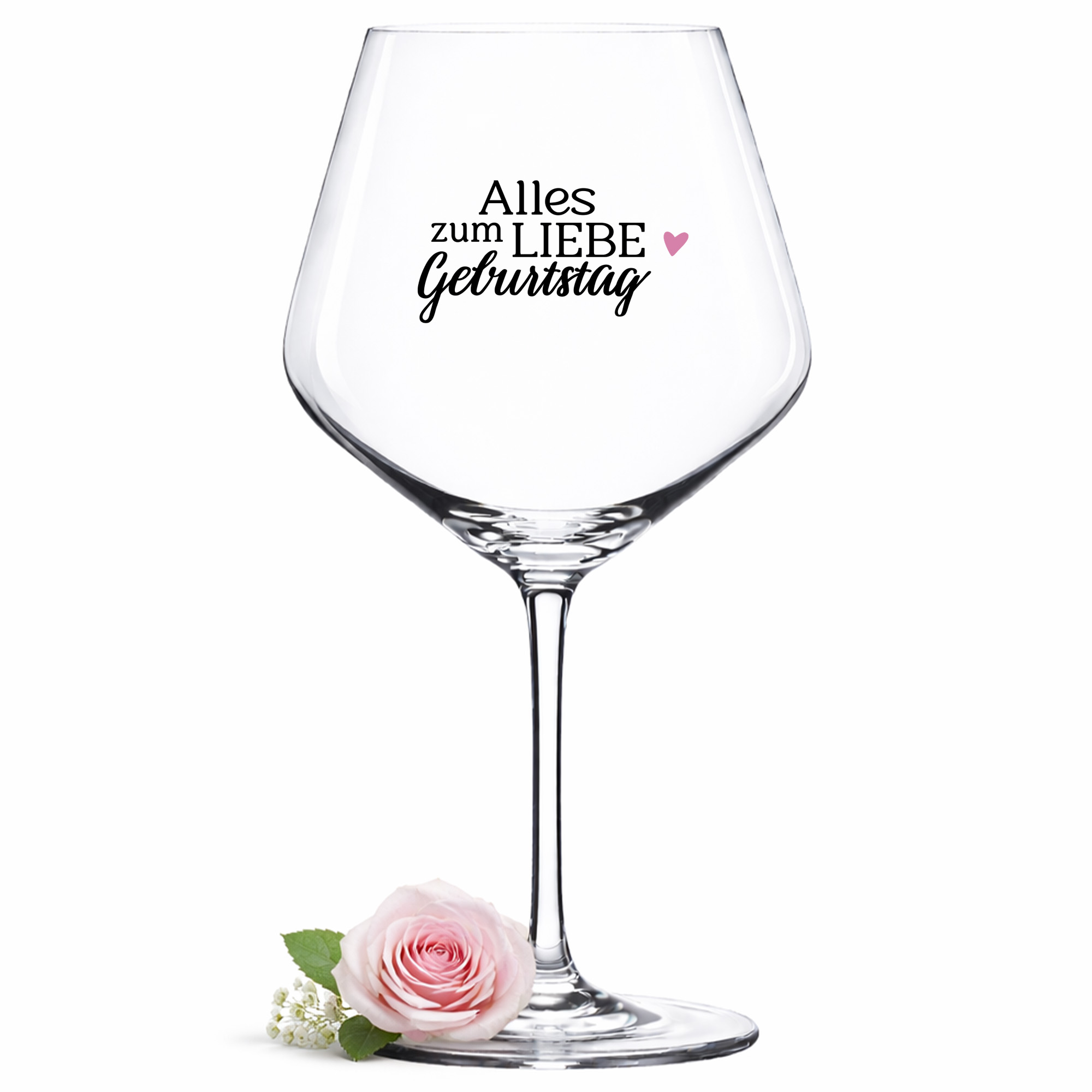 Dieses elegante Weinglas mit dem Schriftzug „Alles Liebe zum Geburtstag“ und Herzmotiv ist eine liebevolle Geschenkidee für einen besonderen Geburtstag.
