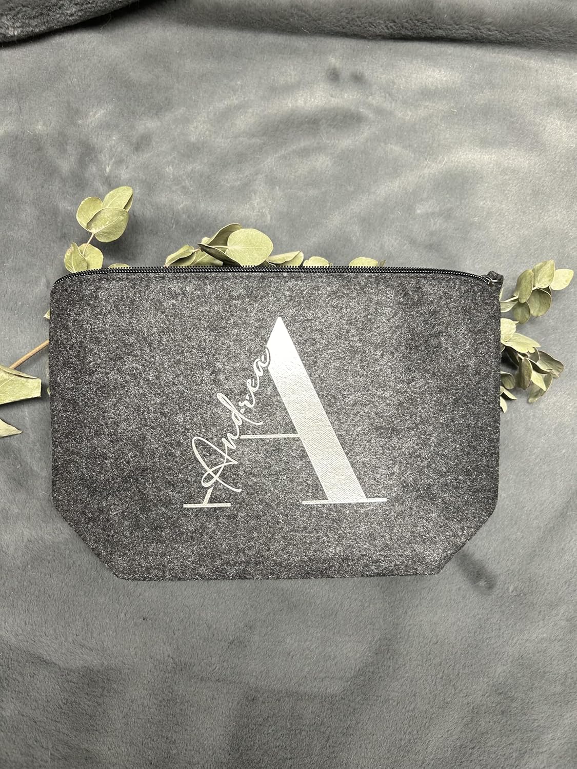 Kosmetiktasche Filz - bedruckt Bruch-Initial & Name dunkelgrau | Beutel-mit-Name | Schminktasche-Mädchen Gr. S&M